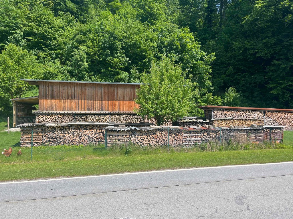 I notice some lovely holiday villas and lodges on the way and people are outside in the sun relaxing and enjoying life. But there is a message about how cold the winters must be. Everyone has masses of wood cut ready.