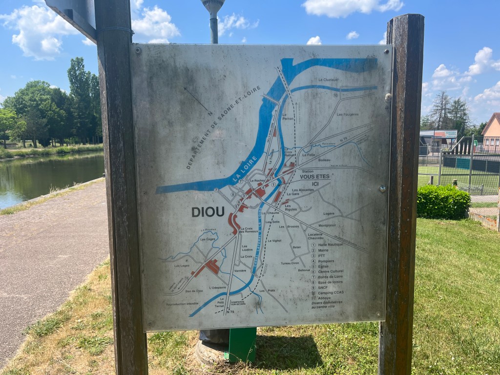 I head further up the canal and Passepartout goes ahead to book in at the campsite. It is full. Luckily Passepartout calls me to tell me just as I have unfrozen my gpx system that is playing up. I have overshot my turn off the canal by about 3 kms but have landed in the village with the only available campsite for the night! Result! We link up and book in to a lovely quiet little municipal campsite on the banks of the Loire in a village called Diou. This time we take no chances. Everything is closed so we drive 7 kms to a Super U and get stuff for a bbq.