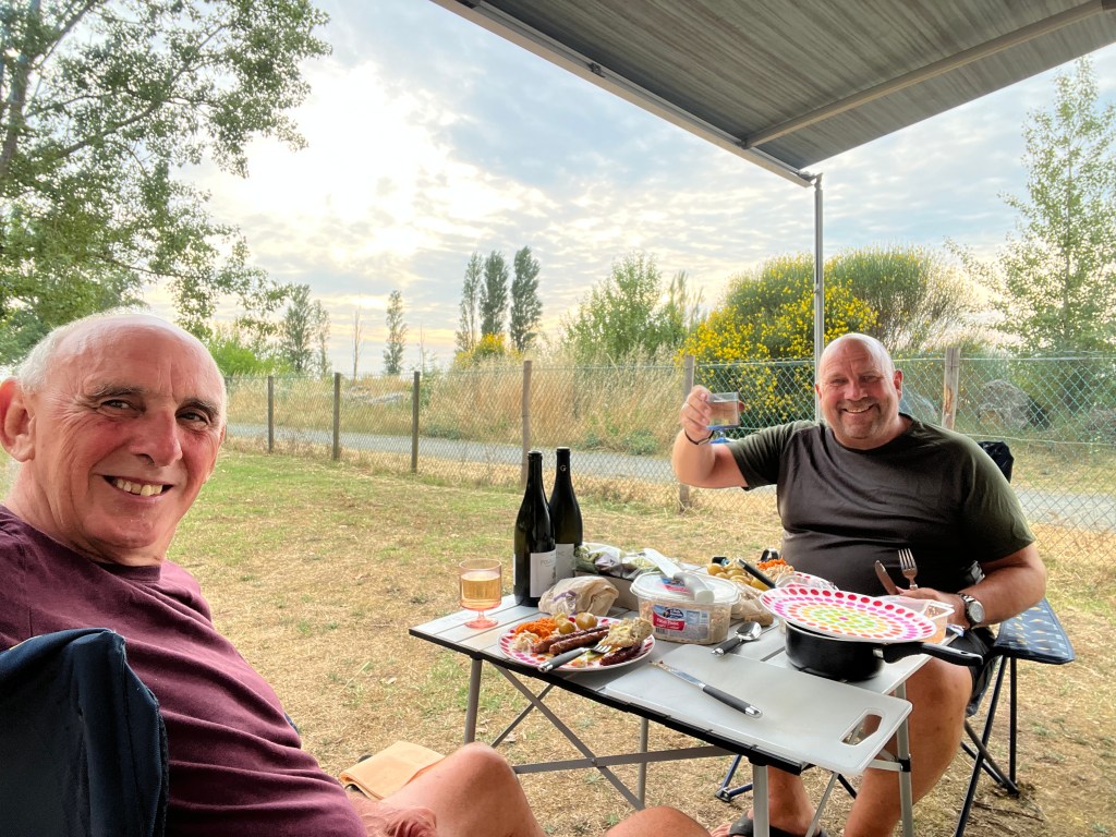 I crack on the other side still on a high. I am happily singing along to myself as I go. Probably connected to the kamikaze french pensioner ramblers, I sing ‘Rule Britannia’ and ‘There will always be an England’. The Brits are coming! Passepartout has gone ahead and booked us in on a campsite at Corsept. That turns out to be almost in St Brevin Les Pins and is only 15 kms from the end! I do 109 kms today and have virtually cracked it. This trip has been cumulatively tiring and after this length of time and distance I have to change down a gear to get over a fag paper. It’s about the right time to finish. How the Tour de France competitors do what they do over a length of time is beyond me. I just have to wait for our reception party to turn up in the morning as agreed to see me over the finish line.